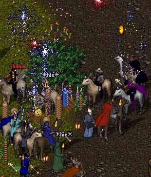 The trek from Yew to Skara's docks was laid with problems as Brigands attacked the large group from every side. Blood amassed in numerous spots along the road, but was little of what would be seen throughout the evening. Reinforcements met up with the running crowd of torch bearers at the crossroads to the west of Britain and escorted them all the way to Skara's docks with relative safety. Parading through the streets of Skara were scores of torch bearing runners as they made their way to the moongate near the bank. It was through these moongates that the torchbearers visited Magincia, Moonglow, Jhelom, and finally made their way to Trinsic. Parading through Trinsic's stone inlaid streets, the runners gallantly made their way across bridges, waterways, and finally made it to the Western gates. One half of the way through their trip, many of the torch bearers grew tired leaving only a handful of folks to continue towards Britain along the main route.