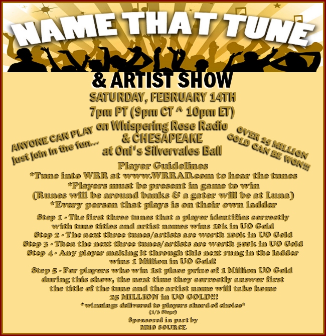 - Saturday - Feb. 14th - Over 25 Million in UO Gold can be won on the shard of your choice!! Anyone can play - just log onto CHESAPEAKE and head to Silvervales Lord & Lady Ball then tune into Whispering Rose Radio at www.wrrad.com to hear the songs. Every person that plays is on their own ladder. Runes found at banks & a gater will be at Luna. For more details CLICK HERE