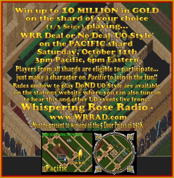 - Saturday - Oct. 11th - WRR Deal or No Deal ~ 'UO Style' is on PACIFIC this week starting at 3pm PT, 6pm ET. Participants will be playing for 10 Million and of course there will be 5 - 250k door prize drawings *remember, you must be there to win*. For a map of the WRR DoND location on PACIFIC... CLICK HERE.