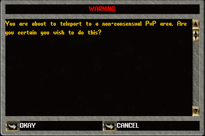 If you are attempting to teleport from a Trammel ruleset to a Felucca ruleset you will be prompted with a warning message in a similar way as a moongate.