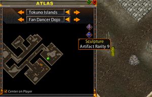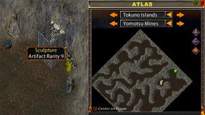 Sculptures can be acquired in the Fan Dancer Dojo for the east facing version and the Yomotsu Mines for the south facing version. Both locations are in the Tokuno Islands. It has a rarity of 9 and therefore spawns approximately every 16 days. A minimum of 100 (Grand Master) stealing skill is required.