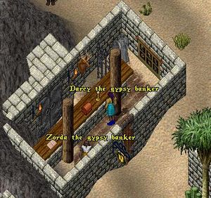 The Desert Outpost (East) is a quasi-town on the Ilshenar facet. There is no Guard Zone and you can cast EVs within the walls of the compound. The NPC vendors cannot be harmed. Unlike its western counterpart, it has a Bank but no stable. There are several other services of interest: